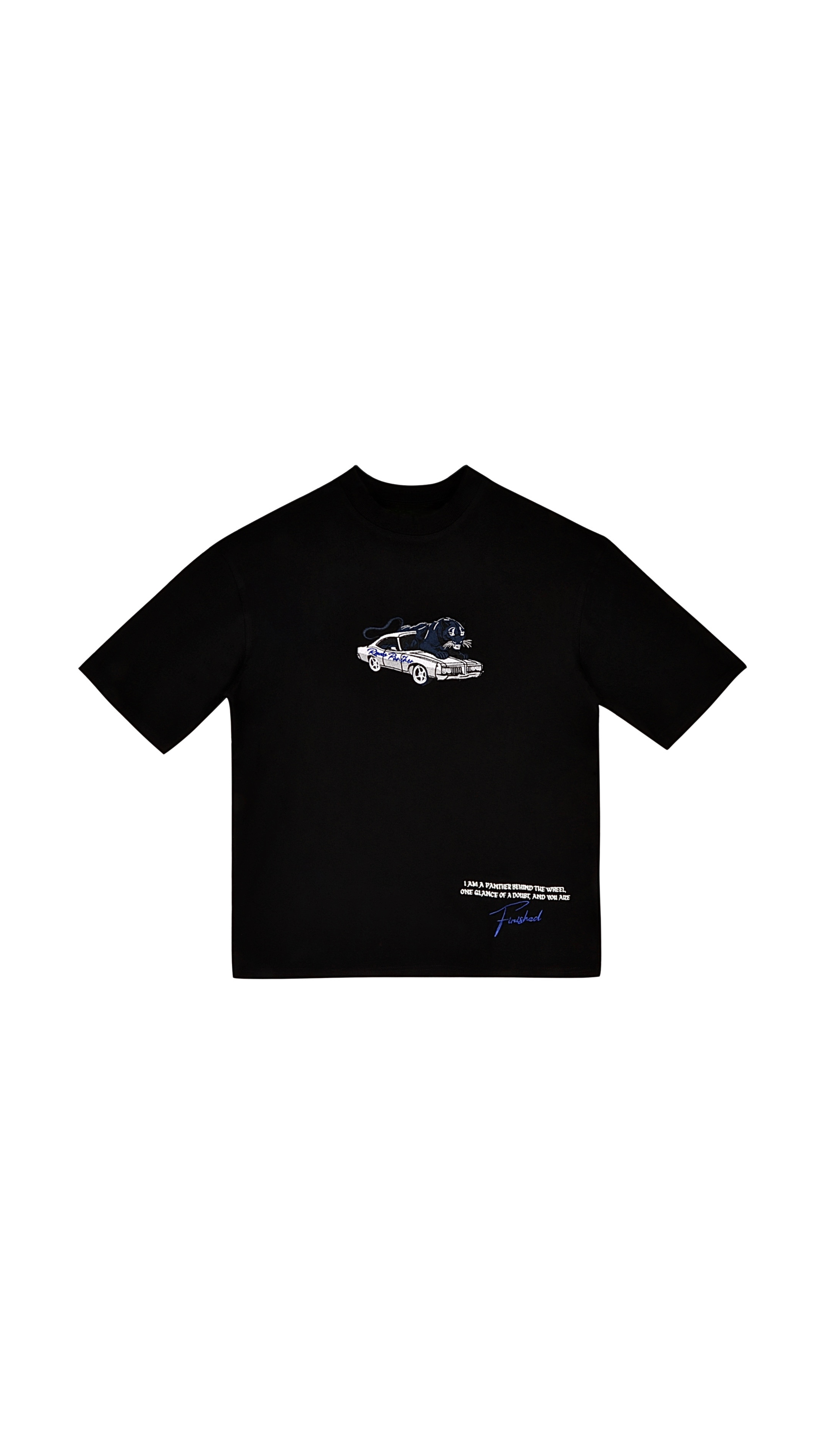 Own the street in silence. The Blacklisted Syndicate T-shirt features a bold panther-car embroidery made with over 1,50,000 stitches, stitched to precision. Finished with puff print on the back, this piece reflects underground dominance in every detail.